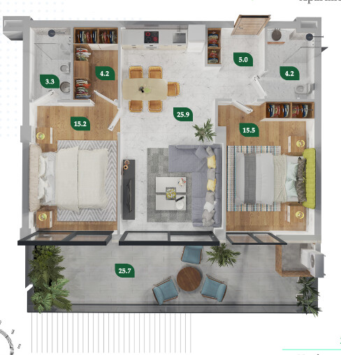 The project offers 1- to 4-bedroom apartments ranging from 51.4 to 584.3 m², including penthouses with terraces on the top floors, delivered in Green Frame condition (pre-finish).